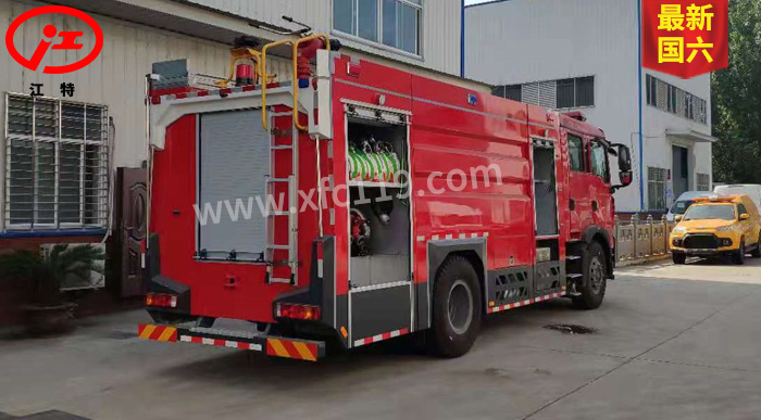 JDF5190GXFPM80/Z6型泡沫消防車為國六消防車車型,采用重汽豪沃ZZ5207TXFV471GF5底盤改裝而成。整車由消防員乘員室和車身兩大部分組成,