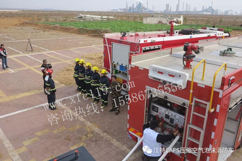 演練中使用的湖北江南專用特種汽車限公司制造的裝載德國CAFS系統(tǒng)的石油石化工業(yè)主戰(zhàn)消防車 。