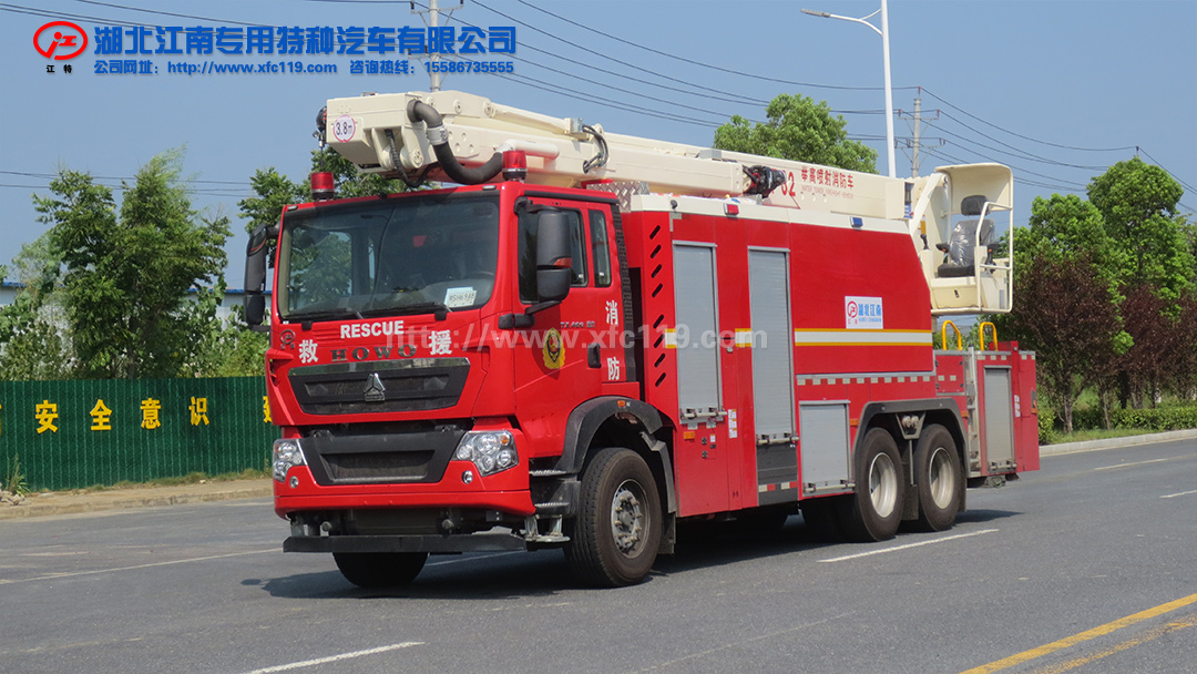江特牌JDF5330JXFJP32型舉高噴射消防車選用中國(guó)重汽T系列豪沃消防車底盤,原廠單排雙開門駕駛室,可載含駕駛員在內(nèi)的乘員2人,駕乘舒適輕便;集水罐車、泡沫車、高噴車三者功能與一身,具有高層滅火、火場(chǎng)監(jiān)控、快速作戰(zhàn)等國(guó)內(nèi)先進(jìn)水平高性能多功能消防車。該車采用電液比例及下車集中控制技術(shù),是全液壓驅(qū)動(dòng)、伸縮加折疊臂式消防車;同時(shí)該車自帶7噸水罐及2噸泡沫罐,可在距離水源較遠(yuǎn)的位置完成消防作業(yè)。該車綜合應(yīng)用新技術(shù)、新工藝、新材料并結(jié)合自身技術(shù)優(yōu)勢(shì),豐富高噴車的功能配置,提高高噴車的單車作戰(zhàn)能力。該車可廣泛應(yīng)用于城鎮(zhèn)、工礦企業(yè)等中高層建筑及石油化工企業(yè)、油罐、倉(cāng)庫(kù)等高大建筑的火災(zāi)撲救,也可作為水罐泡沫車單獨(dú)使用。
