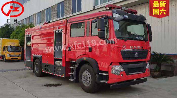 JDF5190GXFPM80/Z6型泡沫消防車為國六消防車車型,采用重汽豪沃ZZ5207TXFV471GF5底盤改裝而成。整車由消防員乘員室和車身兩大部分組成,