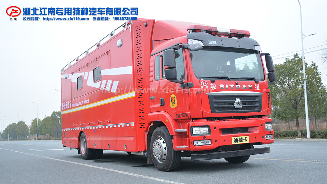整車(chē)上裝為整體式框架結(jié)構(gòu),龍骨采用優(yōu)質(zhì)型材焊接,外蒙皮為航空鋁材,廂體四壁和頂板均為真空負(fù)壓復(fù)合板材結(jié)構(gòu),廂體外廓采用專(zhuān)用鋁型材包角,滿足輕量化和整車(chē)強(qiáng)度要求。車(chē)輛頂部四周配備頻閃警燈及場(chǎng)地照明燈,下裙邊設(shè)計(jì)有專(zhuān)用雜物艙;車(chē)門(mén)、艙門(mén)均采用專(zhuān)用型材結(jié)構(gòu),可靠性高并具有良好的密封性。廂體內(nèi)采用優(yōu)質(zhì)塑膠地板,防滑防腐耐酸耐堿;廂體四壁及頂部骨架填充隔音隔熱材料,室內(nèi)裝飾采用綠色環(huán)保材料,造型美觀易于清洗,防火阻燃等級(jí)符合GB8624B1標(biāo)準(zhǔn)。整車(chē)優(yōu)質(zhì)烤漆工藝主色為消防紅,可以根據(jù)用戶(hù)需求設(shè)計(jì)軍警制式外觀車(chē)貼。