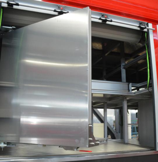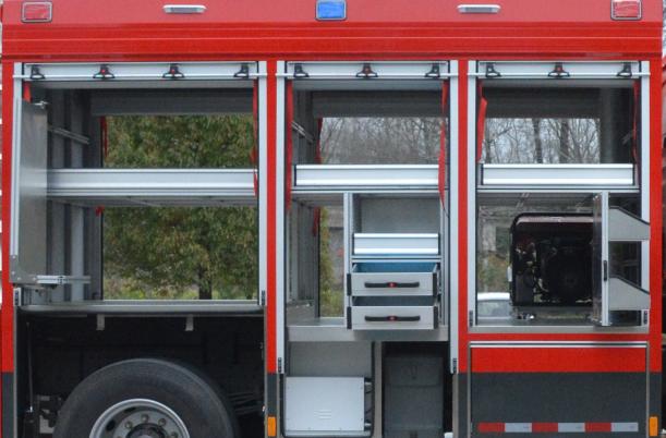 右側(cè)后器材艙布置有立式旋轉(zhuǎn)拓展板,前板裝配有雙層器具收納盒,收納存放小型工具和專用器材,背板采用掛式支架,收納專用扳手、卡鉗、剪刀等器具;右側(cè)前器材艙布置有立式抽拉拓展板機構(gòu),采用重型多節(jié)滑軌抽拉式結(jié)構(gòu),方便消防員快速取用/收納器材和專用工具等。