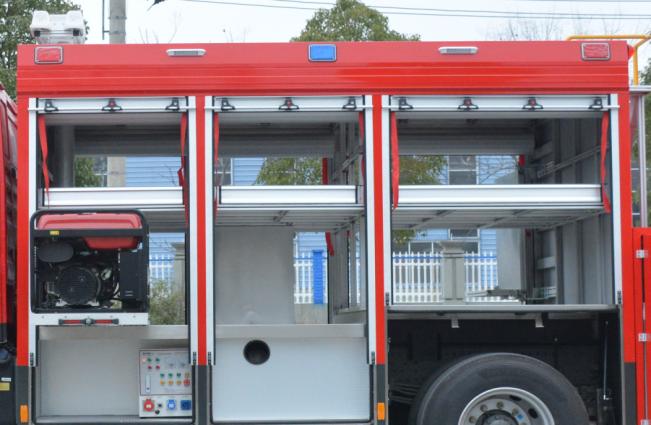 發(fā)電照明區(qū)左側(cè)器材艙布置有平式拓展板裝載汽油發(fā)電機,給整車應(yīng)急供電;右側(cè)器材艙布置有立式旋轉(zhuǎn)拓展板,方便消防員快速取用/收納器材和專用工具;中間布置有大功率高桿升降照明裝置,為救援現(xiàn)場提供場地照明和指向照明,為救援現(xiàn)場提供可靠保障。