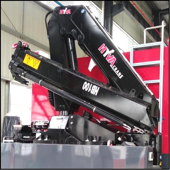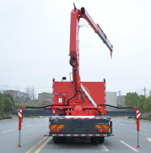 吊裝作業(yè)區(qū)主要裝備折疊臂吊裝設(shè)備,配備有伸縮臂液壓支腿及雙側(cè)操控接口,吊裝作業(yè)區(qū)左右側(cè)均配備有器材艙,放置支腿墊木等隨車器材裝備,右側(cè)還設(shè)計有登頂梯臺,配備上車拉手及安全護欄。
