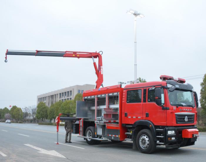 整車主要由汕德卡ZZ5206N471GF5特種作業(yè)車底盤、上裝廂體、電源保障系統(tǒng)、隨車起重折臂吊機、高桿照明系統(tǒng)、器材艙、平式/立式拓展板機構(gòu)、卷簾門、梯臺及護欄、警燈警號、隨車器材等組成。